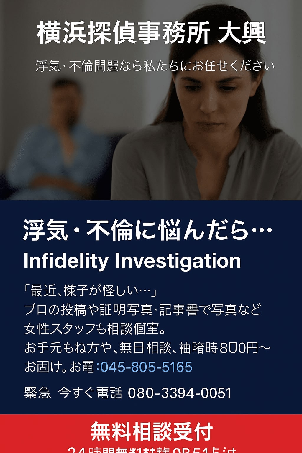 浮気や不倫の悩みは、一人で抱え込むほど 心の負担が大きく なります。 横浜大興では、長年の調査経験を持つスタッフが 「確かな証拠」「安心できる説明」「丁寧なサポート」 をご提供いたします。
